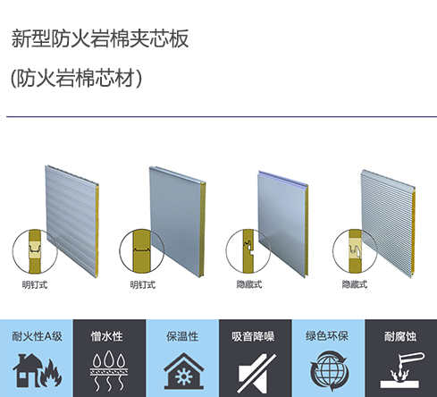 巖棉夾芯板是選用兩層高品質的彩涂涂層鋼板或其他精密壓型的金屬板做面板,輥壓成型 后,將分條后的巖棉90度旋轉(使其纖維垂直于上下兩層鋼板),通過高強度、高粘結力、 高防火的粘結劑,將優(yōu)質巖棉與金屬板粘結、復合而成美觀、平整、剛韌的建筑板材