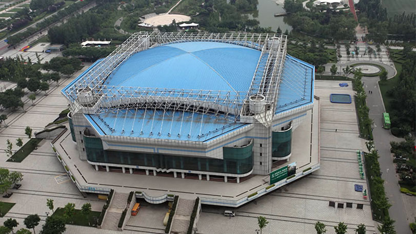 西安市體育館于1997年開始建設,1999年8月竣工。它是西安體育中心的標志性建筑,先后承辦了第四屆城市運動會體操比賽和閉幕式,中國東西部經濟合作與貿易洽談會開幕式等活動。采用寶鋼海藍聚酯彩涂。基板為180克/平方米的熱鍍鋅,牌號為TSt01。使用了12年后,涂層顏色依然鮮艷