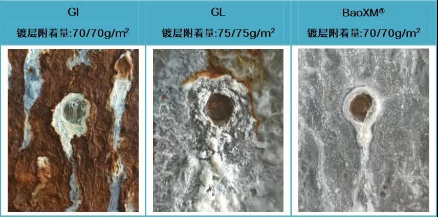 BaoXM®鍍層耐蝕性受切口影響最小,切口耐蝕性較GI、GL更為優異。