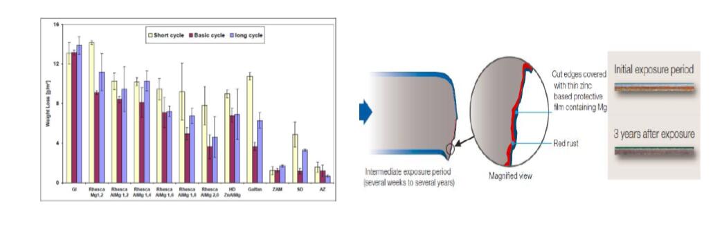 加Mg之后的另一大優(yōu)點(diǎn)是鋼板的切邊耐蝕性提高,含Mg的Zn基腐蝕產(chǎn)物會(huì)覆蓋在切口表面,從而對(duì)切口形成保護(hù)。
