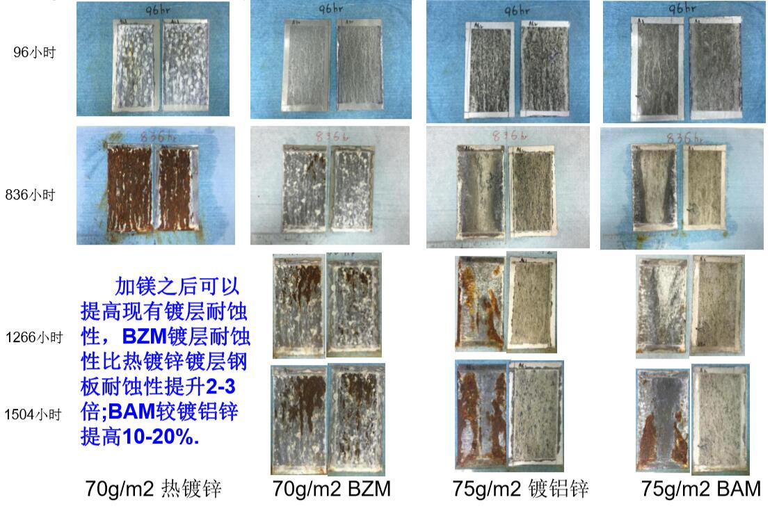 最大的優(yōu)點(diǎn)是耐蝕性,公開的實(shí)驗(yàn)室加速實(shí)驗(yàn)、戶外暴露實(shí)驗(yàn)等結(jié)果表明,一定范圍內(nèi)Al、Mg含量增加會(huì)提高耐蝕性幾倍到十幾倍.