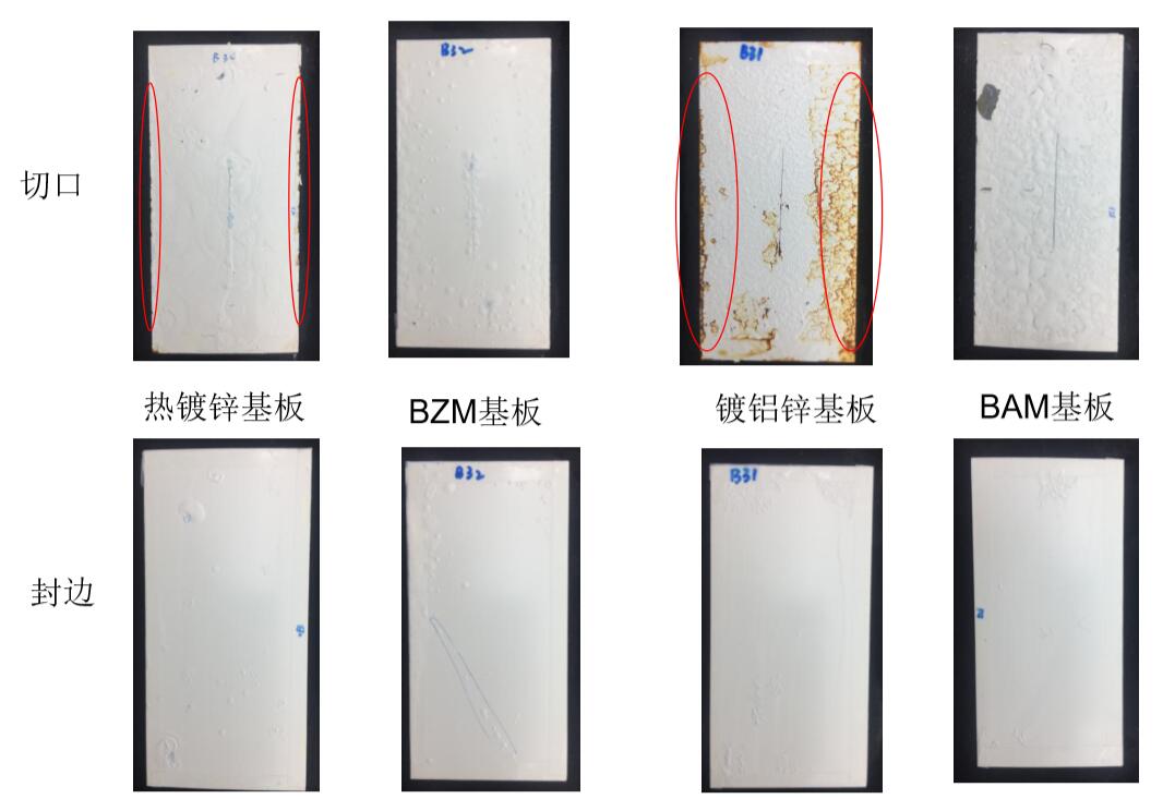 1.與現(xiàn)有熱鍍鋅基板建筑彩涂相比,BZM鍍層基板涂層裂紋明顯,但是鍍層裂紋與熱鍍鋅基板一致
