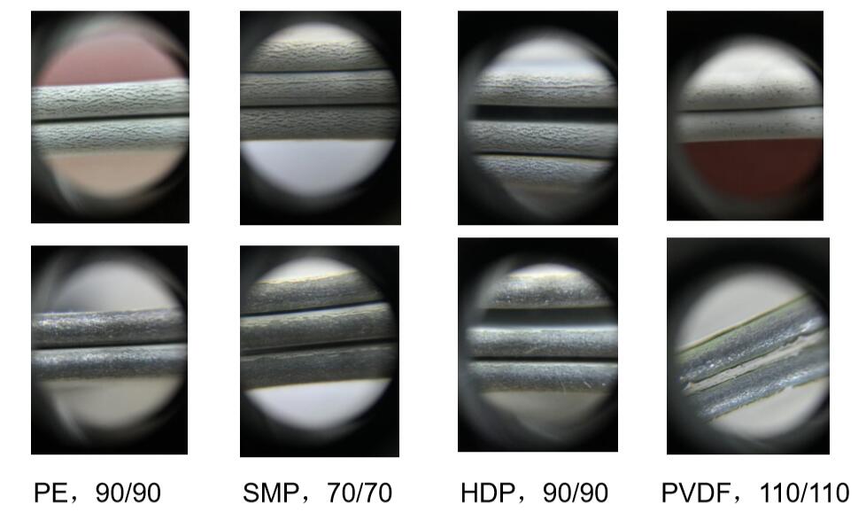 2.與現(xiàn)有鍍鋁鋅基板建筑彩涂相比,涂層裂紋基本一致,但是鍍鋁鋅鍍層裂紋比BZM鍍層明顯。