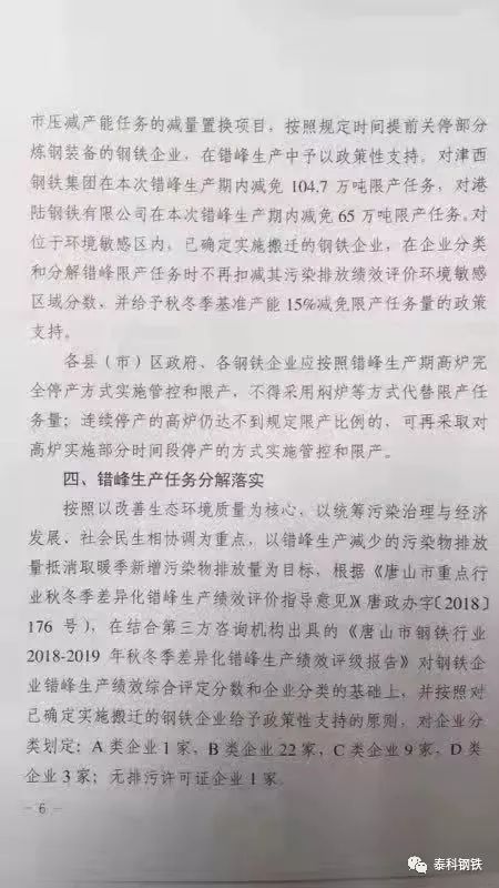 日前,唐山市2018-2019年秋冬季鋼鐵行業錯峰生產方案經過市政府15屆17次常務會議審議通過,主要內容為:分類執行,對提前關停部分煉鋼設備的津西鋼鐵和港陸鋼鐵將分別減免104.7萬噸、65萬噸限產任務。