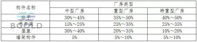 各種構(gòu)件的用鋼量占整個廠房鋼結(jié)構(gòu)的總用鋼量的比值大致如表所示。
