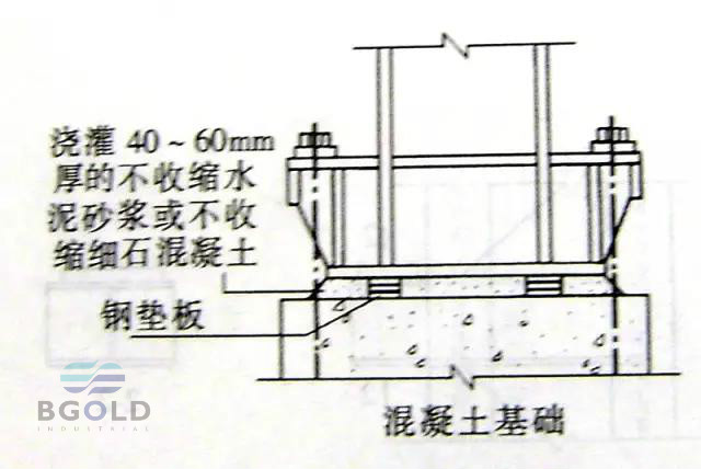 a. 墊板應(yīng)設(shè)置在靠近地腳螺栓的柱腳底板加勁板下,每根地腳螺栓側(cè)應(yīng)設(shè)1~2組墊板。墊板與基礎(chǔ)面得接觸應(yīng)平整、緊密。二次澆灌混凝土前墊板組間應(yīng)點(diǎn)焊固定。