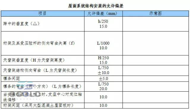 屋面系統(tǒng)結(jié)構(gòu)安裝的允許偏差應(yīng)符合下表規(guī)定。