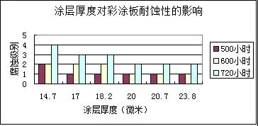 從微觀上講、涂層是多空的組織。空氣中的水、腐蝕介質(氯離子等)就會通過涂層的薄弱部分侵入,造成膜下腐蝕,進而涂層起泡并剝落。另外,即使同樣涂層厚度,二次涂層要比一次涂層致密。根據國外報道和相關腐蝕試驗結果,正面涂層20μm以上才能有效的防止腐蝕介質的侵入,由于底漆和面漆的防腐蝕機理不同,不僅要規定總膜厚,還有分別要求底漆(》5μm)和面漆(》15μm)的厚度,只有這樣,才能保證彩涂鋼板不同部位的耐蝕性是均衡的。