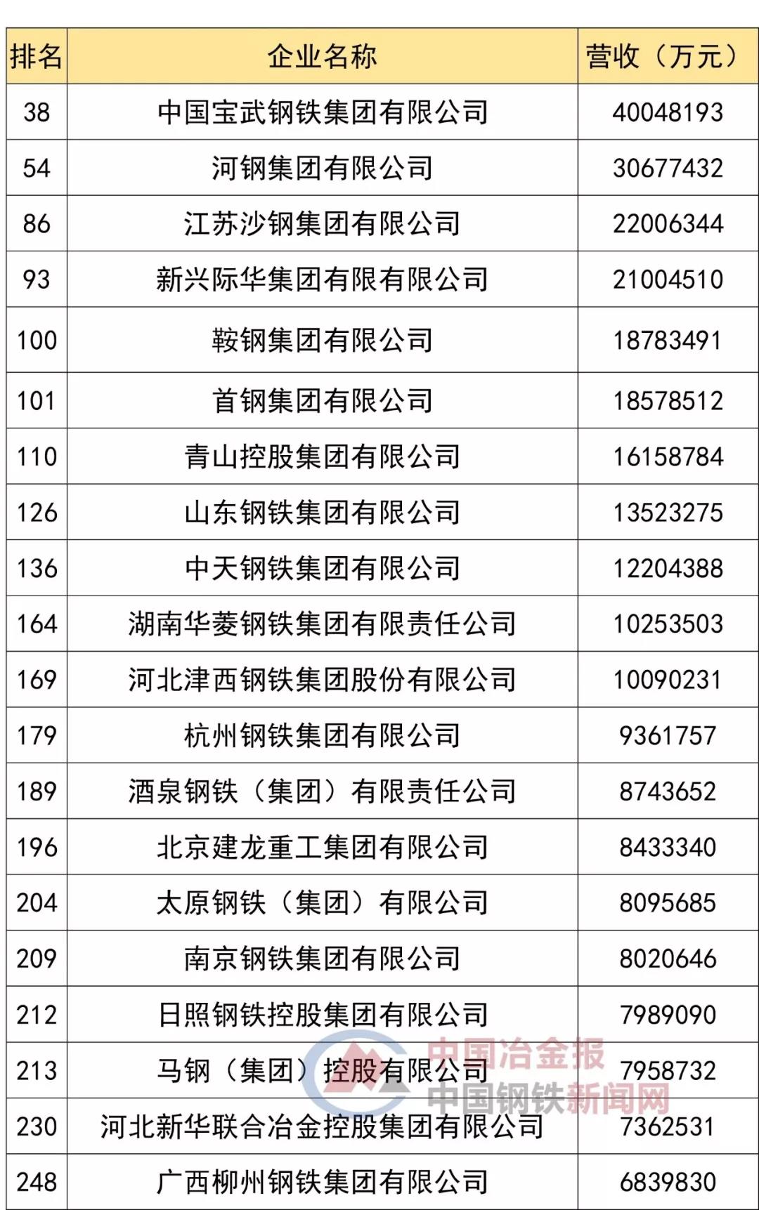 9月2日,由中國企業聯合會、中國企業家協會連續第17次向社會公開發布的“中國企業500強”排行榜今日在西安揭曉。47家鋼鐵企業入選。其中中國寶武、河鋼集團、沙鋼集團分別以營收4004億元、3067億元、2200億元位居鋼鐵板塊前三名。在500強榜單中,分別排名為38位、54位、86位。
