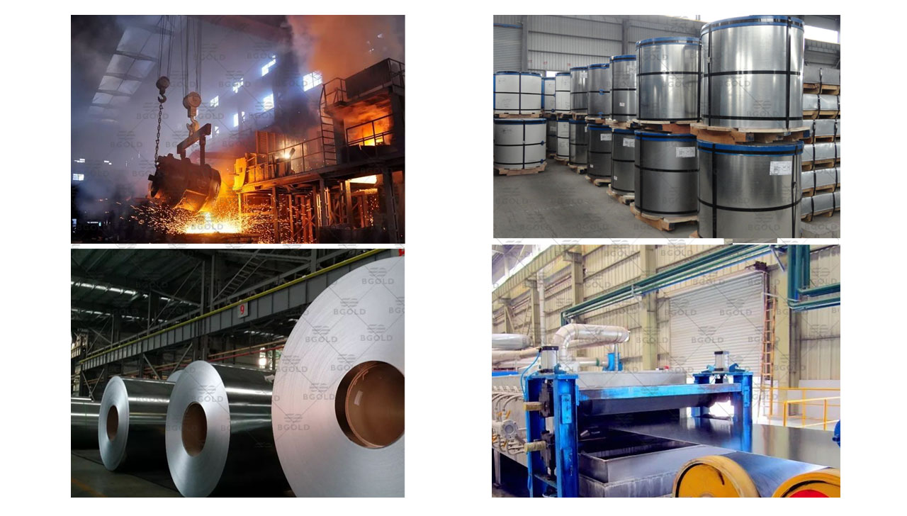 生產加工鍍鋅鋼卷可以分為三大步:首先將整卷帶鋼進行酸洗除銹、除污,讓鍍鋅鋼帶表面達到光亮干凈的效果;酸洗后,通過氯化銨或氯化鋅水溶液或者氯化銨和氯化鋅混合水溶液中進行清洗,然后送入熱浸鍍槽內,進行鍍鋅工藝;待鍍鋅工藝完成后即可入庫包裝。