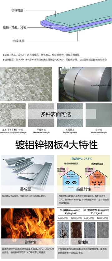 熱鍍鋁鋅鋼板是以各種強度和厚度規(guī)格的冷軋鋼板為基材,連續(xù)熱鍍鋁鋅生產線生產的、由鋁鋅合金組成的鍍層,鍍層中鋁的質量百分數(shù)約為55%,硅的質量百分數(shù)約為1.5%,鋅的質量百分數(shù)約為43.5%,經過大量實驗證明該配比具有最佳抗腐蝕性能。融合了Al的物理保護和高耐久性以及Zn的電化學保護特性,在其表面呈具有高裝飾性的光亮銀灰色澤及規(guī)則的花紋,并具有浮凸感。